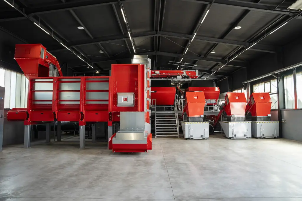 Red industrial sorting machine inside a processing facility with green conveyor belts and metal walkways.